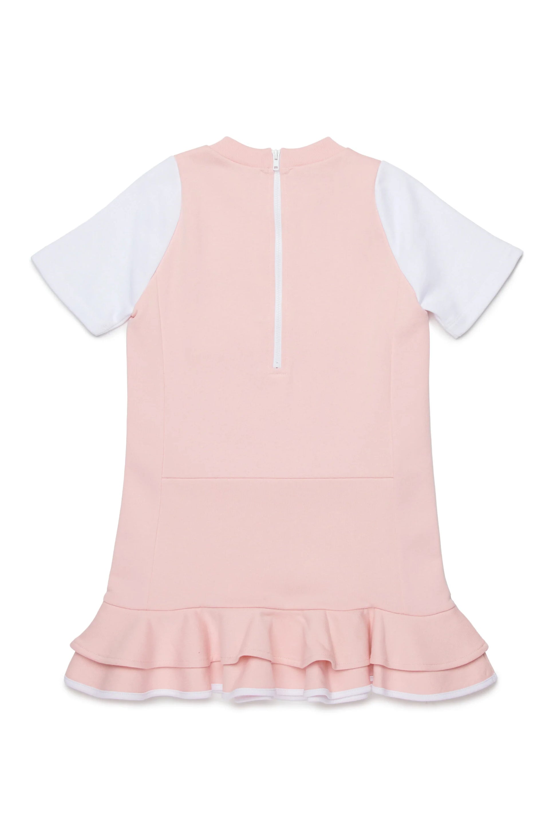 Mini dress with logo and embroidered rose on the chest, embellished with sequin appliqués and a ruffled hem.